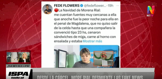 Diego Suárez Mazzea invitó a repasar la información de su colega al aire de NET TV. “La Navidad de Morena Rial: “Me cuentan fuentes muy cercanas a ella que anoche fue la peor noche para ella en el penal de Magdalena, que no quiso salir de la celda hasta que una compañero la convenció tipo 23hs, cenaron sándwiches de miga, carne al horno con ensalada y estaba muy deprimida. Morena entre llantos brindó y se fue a dormir”, escribió el periodista en su cuenta de X.