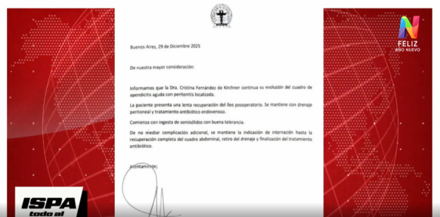 Tras la internación del pasado 20 de diciembre por un dolor abdominal y una apendicitis aguda con peritonitis localizada, la expresidenta de la Nación continúo su rehabilitación en el Sanatorio Otamendi y circularon diferentes versiones al respecto. "Se mantiene la indicación de internación hasta la recuperación completa del cuadro abdominal, retiro del drenaje y finalización del tratamiento antibiótico", indicó el informe médico.