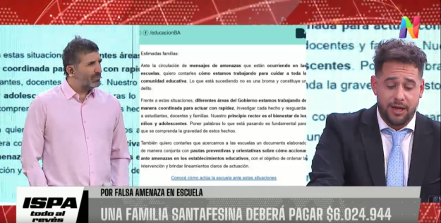 “Es para que los padres y madres tengan en cuenta que sus hijos hacen esta broma y tienen consecuencias legales. Hay que hablarle a los chicos de esto en casa. En el colegio de mi hijo pasó y no se evacuó, algo que no me pareció bien. Por más que sea un chiste para algunos, puede ser que alguno sea verdad“, complementó el conductor del programa de actualidad de NET TV.