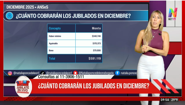 En una nueva entrega de ‘Jubilate en vivo’, la Dra. Natalia Ponce de León se metió de lleno con todos los detalles de los aumentos que recibirán los jubilados y pensionados en el mes de diciembre, un pago que incluye tres componentes clave.