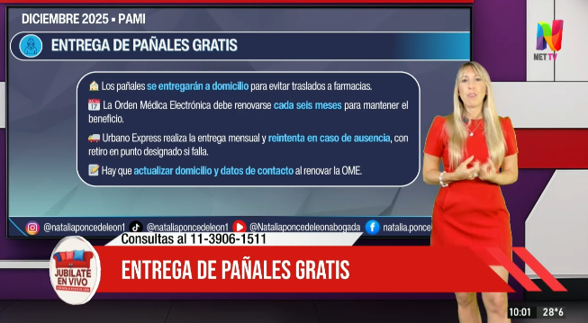 En una nueva entrega de ‘Jubilate en vivo’, la Dra. Natalia Ponce de León se metió de lleno con las últimas novedades en torno a los jubilados y aprovechó para dar a conocer una excelente noticia para aquellos adultos mayores que requieren el uso de pañales, quienes a partir del mes de diciembre podrán gozar del beneficio de recibir este insumo de forma totalmente gratuita en la puerta de su casa.