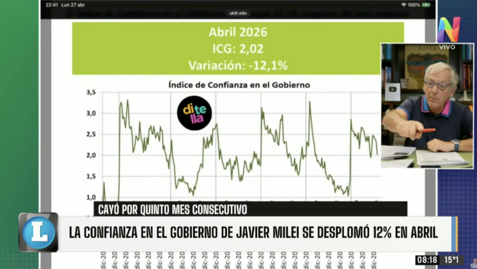 En una nueva entrega de su ciclo matutino, Marcelo Longobardi puso bajo la lupa el reciente informe elaborado por la Universidad Torcuato Di Tella y la consultora Poliarquía, el cual presenta el Índice de Confianza en el Gobierno. Este indicador clave, que funciona como un termómetro sobre la gestión de Javier Milei, registró una caída del 12,1 por ciento durante el mes de abril, marcando una tendencia que preocupa tanto al arco político como al sector financiero por su capacidad para predecir el clima electoral.