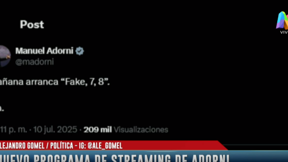 Pero más allá de el auge que tuvo en el ámbito político, Manuel Adorni ahora contará con un programa de televisión que tendrá un nombre particular y fue informado por Alejandro Gomel, en la mañana de este viernes 11 de julio, en ‘Modo Fontevecchia‘. “Es un nuevo canal de streaming que lanza el vocero presidencial y que hace referencia a aquel programa de TV Pública llamado ‘6, 7, 8‘ y que ahora será ‘Fake, 7, 8‘ en el que mostrarán las son consideradas noticias falsas para el Gobierno”, comenzó diciendo el columnista.