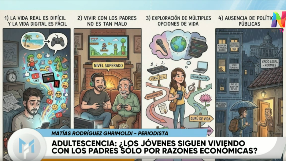 En cuanto a la tercera opción de los motivos de las ‘Adultescencia’, Matías Rodríguez Ghrimoldi precisó al aire de NET TV: “‘Exploración de múltiples opciones de vida‘. Antes madurar era un camino simple, irse de la casa y trabajar, pero hoy hay autores como Ulrich Beek que explica que lo que hubo fue una individualización de los caminos de vida y de las opciones biográficas. Hay muchas maneras de volverse adultos, tantas que hay que elegirlas”.