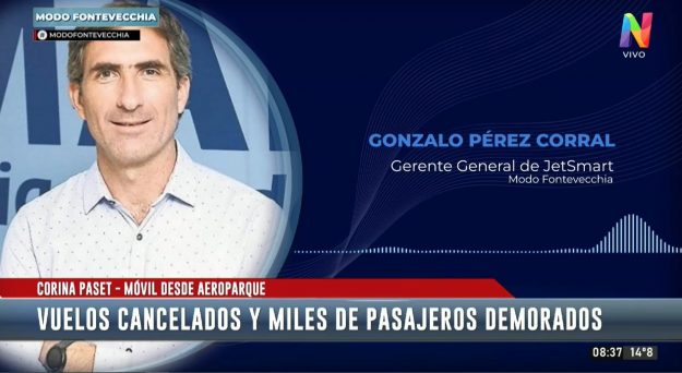Gonzalo Pérez Corral, el Gerente General de JetSmart, dialogó con el móvil del informativo matutino de Net Tv, dio detalles sobre la situación que están atravesando desde hace más de 15 horas. El empresario contó que debieron cancelar 15 vuelos domésticos que estaban programados para este mismo martes debido a las “complicaciones generadas por la medida de fuerza justificadas” que los empleados de Intercargo llevan adelante.
