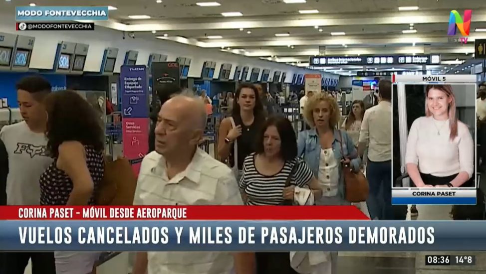 La cronista de Modo Fontevecchia, Corina Paset, transmitió en directo desde el hall de embarque del Aeroparque “Jorge Newbery” e ilustró el caótico panorama: largas filas de pasajeros que buscan novedades sobre los vuelos demorados y cancelados. Tal como informó la periodista, unos 7 mil tripulantes fueron afectados por esta situación.