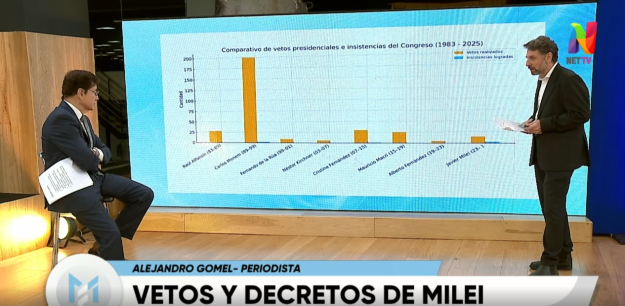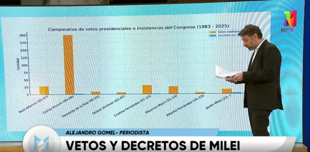 Alejandro Gomel, periodista de Modo Fontevecchia, realizó un informe que compartió junto a Jorge Fontevecchia y los televidentes de Net TV acerca de lo que fueron hasta el momento los vetos y decretos impulsados por Javier Milei desde que gobierna. “Es llamativa con la debilidad política que quedó con los puentes cortados con lo gobernadores y con el parlamento, ni hablar con sectores sociales o sindicales donde prácticamente no hay diálogo“, comenzó diciendo el columnista.