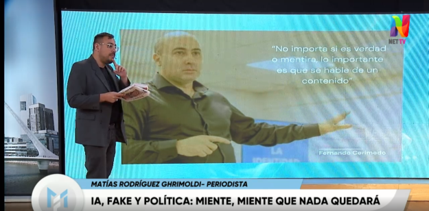 Posteriormente, Matías Rodríguez Ghrimoldi hizo hincapié en la frase “llenar la zona de mierd*” de Steve Bannon, ex-estratega de Donald Trump: “Es la nueva estrategia de la extrema derecha actual. Hay que combinar la cantidad de información entre cosas verdaderas y falsas no para que vos creas, por ejemplo, que Axel Kicillof dijo eso sino para que no sepas qué diría él, para que se rompa la verdad misma”.