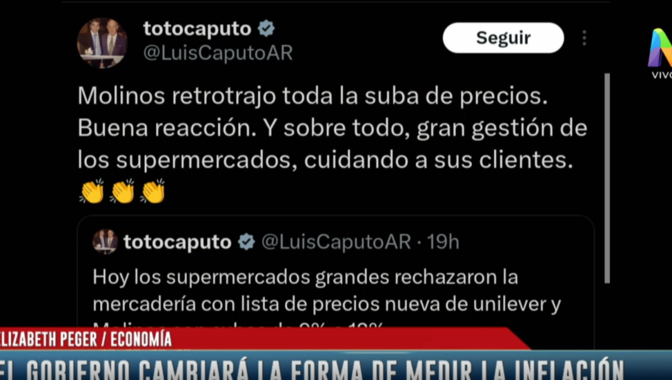 La desaparición de las limitaciones cambiarias fueron anunciadas con días de anticipación y ya el fin de semana los proveedores entregaban lista de precios con actualizaciones a los diferentes supermercados y negocios, lo cual generó mucha polémica y que Luis Caputo, actual ministro de Economía de la Nación, escriba en X en contra de reconocida empresa Molinos. “Molinos retrotrajo toda la suba de precios. Buena reacción. Y sobre todo, gran gestión de los supermercados, cuidando a sus clientes“, expresó el funcionario oficialista en su cuenta de la red social de Elon Musk.