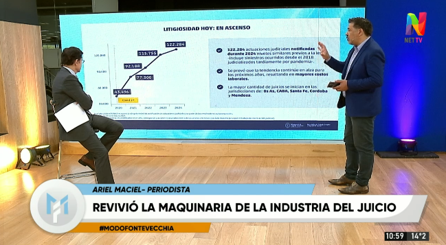 En una nueva entrega de ‘Modo Fontevecchia’, el periodista Ariel Maciel presentó un informe sobre el incremento de los reclamos obreros donde detalló el registro de más de 2 billones de pesos en montos reclamados durante un período de 12 meses. La exposición subrayó cómo esta oleada de causas no responde a un alza en siniestros laborales, sino a evaluaciones médicas judiciales que superan en un 12,5% las normas oficiales, agravadas por tasas de interés desproporcionadas.