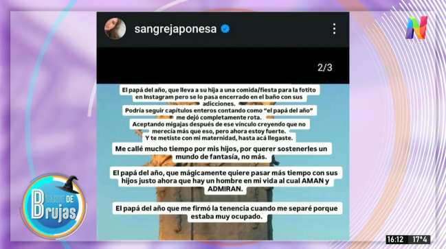 En una nueva emisión de ‘Tarde de Brujas’, Anamá Ferreira y su equipo se sumergieron en la controversia desatada por el furioso posteo de Eugenia ‘La China’ Suárez en Instagram, donde acusó a Benjamín Vicuña de ser un ‘mal padre, pésimo marido y miserable’ por revocar el permiso judicial para que sus hijos, Magnolia y Amancio, viajaran con ella y Mauro Icardi a Turquía.