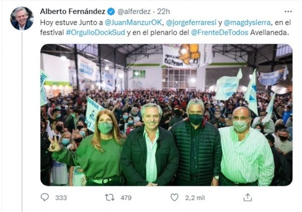 El Presidente caminó entre la multitud, participó de un plenario del Frente de Todos junto con Jorge Ferraresi, el Ministro de Desarrollo Territorial y Hábitat de la Nación y del Ministro de Gabinete Juan Manzur.