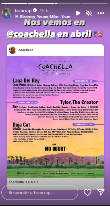 En la noche del martes, el músico reveló que este año será parte del festival estadounidense Coachella. Junto a grandes artistas de todo el mundo como Blur, No Doubt, Lana del Rey, Doja Cat y muchos más, el productor tiene asignados los días 12 y 19 de abril de 2024.
