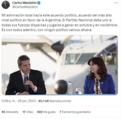 Siendo que Maslatón se ha forjado como un líder de opinión política en redes, minutos atrás escribió en la red social del pajarito: “Mensaje para militantes, dirigentes intermedios, simpatizantes y votantes de La Libertad Avanza y de Javier Milei: No se tiren contra Sergio Massa, porque las listas de Milei en todo el país están integradas por massistas en acuerdo de conveniencia electoral con libertarios”.