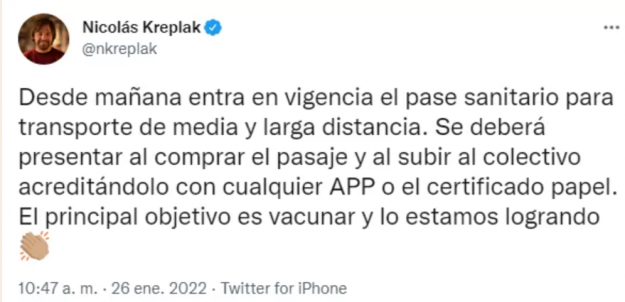 En su cuenta de Twitter Kreplak informó esta noticia. “Desde mañana entra en vigencia l pase sanitario para transporte de media y larga distancia. Se deberá presentar al comprar el pasaje y al subir al colectivo acreditándolo con cualquier APP o el certificado en papel. El principal objetivo es vacunar y lo estamos logrando”, finalizó.