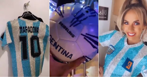 Se inclinó por un short y camisa deportiva, botines, medias altas y una pelota con la bandera argentina. El detalle que hizo único a este traje fue que todo el look estuvo cubierto por cientos de cristales y brillantes. Además, incluyó la firma de Diego Maradona y una remera con su rostro que dejó ver cuándo se desabotonó la camisa que llevaba encima.