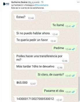 El funcionario informó que tomaron el control de su WhatsApp y empezaron a pedir transferencias en su nombre