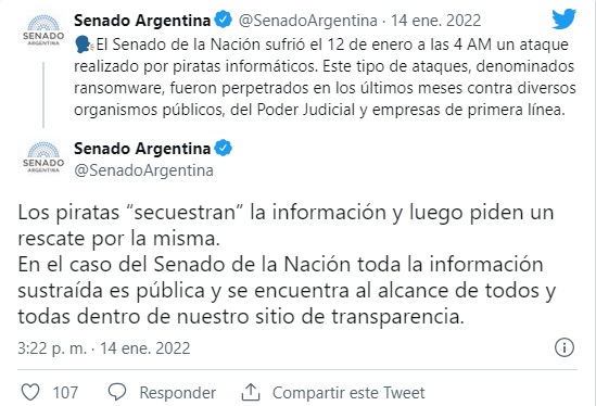 Tras filtrarse la noticia por varias fuentes, el Senado de la Nación publicó en su cuenta de Twitter oficial que “sufrió el 12 de enero a las 4 AM un ataque realizado por piratas informáticos“.