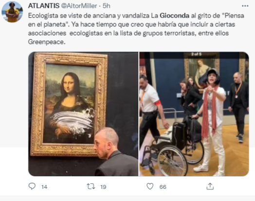 Muchos usuarios de la red social del pajarito apuntaron contra las organizaciones ecologistas, ya que el atacante escgrimió estos argumentos. Además, se han viralizado fotos en la que comparan el disfraz del vándalo con El Chavo del 8.