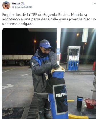 “Empleados de la YPF de Eugenio Bustos, Mendoza adoptaron a una perra de la calle y una joven le hizo un uniforme abrigado“, escribió un internauta llamado Néstor Robledo. La imagen que acompaña al tuit fue tan impactante que alcanzó más de 71 mil ‘me gusta’ y 640 ‘compartidos’, cifras que continúan en ascenso.
