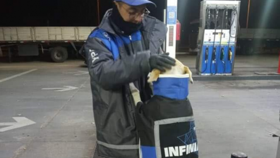 A causa de las bajas temperaturas, los empleados del establecimiento petrolero notaron que la cachorra pasaba mucho frío. En el afán de ayudar, le cosieron un chaleco bien abrigado. Con mucho relleno, doble capa y cuello alto para proteger la garganta. ¡Idéntico al que ellos usan en su jornada laboral!