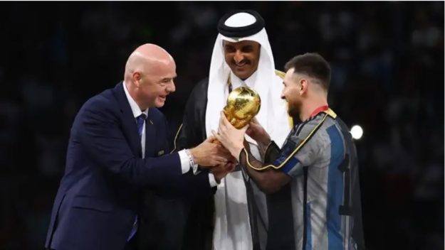 En el inolvidable momento en que Lionel Messi sube al escenario para recibir la Copa del Mundo en el estadio Lusail de Doha, el público argentino se sorprendió por la extraña túnica semitransparente que le dan al Capitán antes de entregarle el premio.