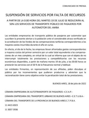 Este martes, y habiendo sido comunicado por C.E.A.P., C.E.T.U.B.A. y C.T.P.B.A., las frecuencias de los transportes se reducirán en un 50%. Entre los motivos que detallaron las cámaras es el "considerable atraso" de los subsidios que otorga el Estado.