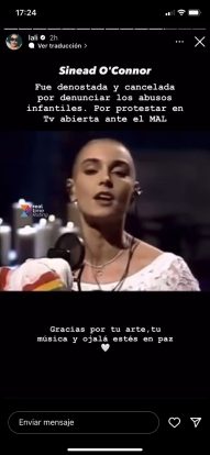 Además, Lali Espósito publicó un mensaje en Instagram en el que relató su valiente activismo: “Sinead O’Connor fue denostada y cancelada por denunciar los abusos infantiles. Por protestar en TV abierta ante el mal. Gracias por tu arte, tu música y ojalá estés en paz”.