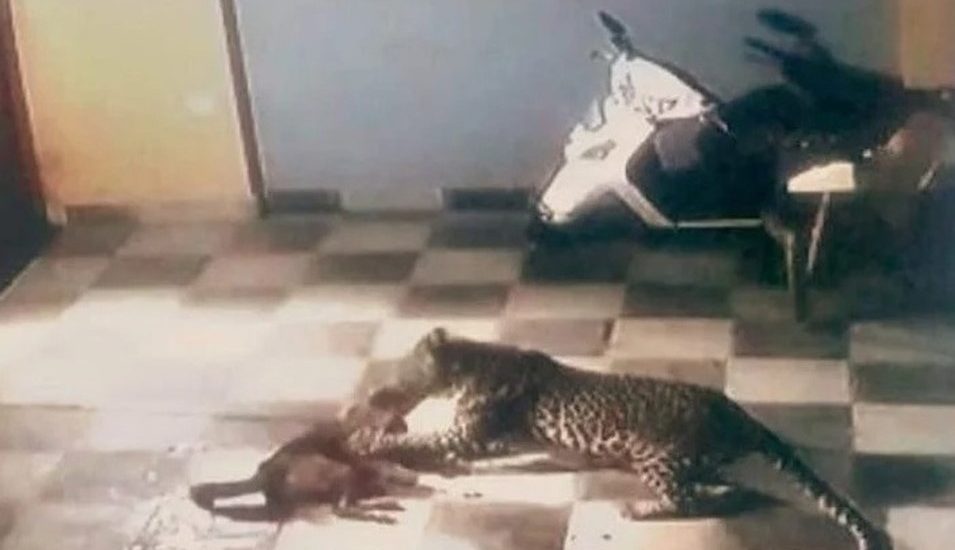 Un leopardo saltó al patio de una casa y tuvo un feroz encuentro con un perro